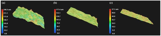 As shown in Figure 12a, the undamaged sodium laurate coating exhibited an undulating rough morphology with a surface roughness of 246.3 μm. In contrast, Figure 12b,c demonstrate significant surface flattening after 10 peeling cycles (roughness: 177.4 μm) and 10 abrasion cycles (roughness: 57.1 μm). Mechanical degradation compromised the roughness structure, directly correlating with hydrophobicity reduction.