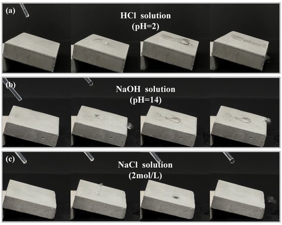Figure 13 illustrates the dynamic interactions of hydrochloric acid (pH = 2), sodium hydroxide solution (pH = 14), and sodium chloride (2 mol/L) solution with the sodium laurate superhydrophobic coating. As shown in Figure 13a, droplets of hydrochloric acid (pH = 2) slide slowly over the superhydrophobic coating surface, leaving visible trails and generating CO2 bubbles. This phenomenon arises because atmospheric exposure causes carbonation of the cement substrate, forming calcium carbonate (CaCO3). The hydrochloric acid corrodes the coating and reacts with CaCO3, producing CO2 gas. Consequently, the coating loses superhydrophobicity, and bubbles form during the reaction. As shown in Figure 13b, sodium hydroxide solution (pH = 14) initially rolls off the superhydrophobic coating surface in a spherical form without adhesion. However, continuous addition of the solution at the same location degrades the coating, resulting in droplets sliding slowly across the surface. This behavior arises from the decomposition of calcium laurate by sodium hydroxide. Progressive sodium hydroxide addition reduces calcium laurate content, diminishing the low-surface-energy components critical to hydrophobicity. As shown in Figure 13c, a 2 mol/L sodium chloride solution droplet rapidly rebounds from or rolls off the superhydrophobic coating surface upon impact. Even under continuous droplet deposition, the solution maintains smooth mobility without adhesion. This behavior stems from the absence of direct chemical reactivity between sodium chloride and calcium laurate, rendering chlorides non-corrosive to the coating.