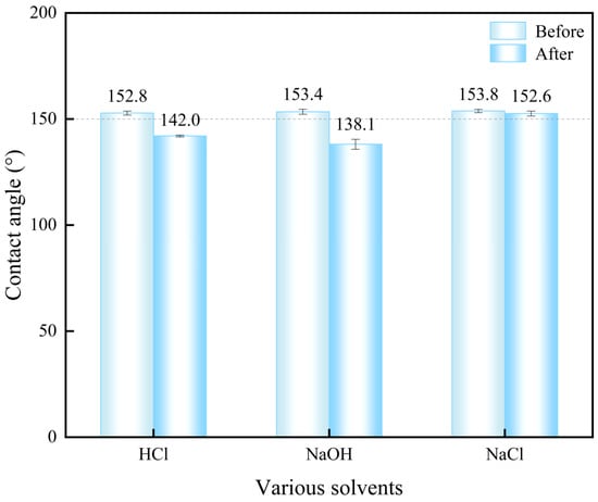 To evaluate the chemical corrosion resistance of the superhydrophobic coating, the CA of HCl, NaOH, and NaCl solutions dropped on the surface were measured and compared with that of the WCA, as illustrated in Figure 14. When HCl and NaOH solutions were dropped onto the superhydrophobic coating surface, the measured CA were 142.0° and 138.1°, respectively. This significant reduction in CA indicates that the coating loses superhydrophobicity due to chemical corrosion-induced damage to its hierarchical rough structure, demonstrating limited resistance to strong acids and alkalis. In contrast, the NaCl solution exhibited a CA of 152.6°, showing negligible deviation from the original WCA (153.8°). This minimal change confirms that the salt solution causes almost no erosion, preserving the coating’s microstructure and hydrophobicity. These results are consistent with the dynamic interaction behaviors observed in Figure 13, where HCl and NaOH degraded the coating, while NaCl maintained non-wetting performance.