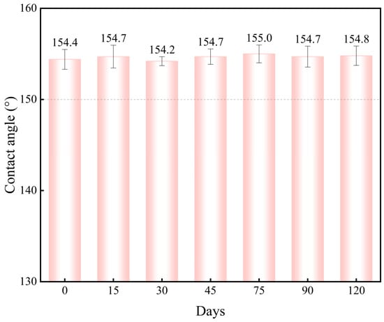 Environmental stability assessment: The coated specimens were aged under ambient indoor conditions (5~35 °C, relative humidity ≤ 60%, atmospheric pressure 101.3 kPa). The WCA was measured at 0, 15, 30, 45, 75, 90, and 120 days to evaluate durability [17,22,24,25].