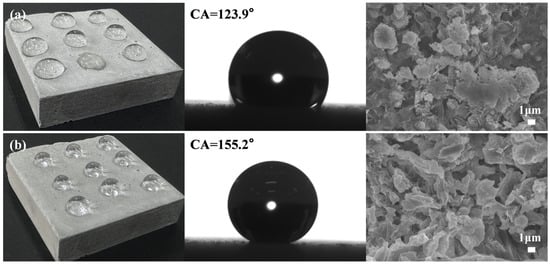 Chemical corrosion resistance evaluation: Solution droplets (pH = 2 HCl, pH = 14 NaOH, 2 mol/L NaCl) were deposited on the coating surface. Test block was tilted to approximately 15° and the solution was dropped onto the coating surface from a height of 2–4 cm. Their contact angles (CA) were measured and compared against the baseline WCA to determine chemical stability [17,18,22,23,24].