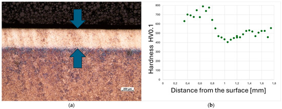 A cross-sectional view of the laser-hardened layer formed on 30HGSNA steel, along with its microhardness profile, is presented in Figure 1. The applied treatment resulted in the formation of a hardened layer with a thickness ranging from 0.5 to 0.8 mm along the entire length of the processed zone.