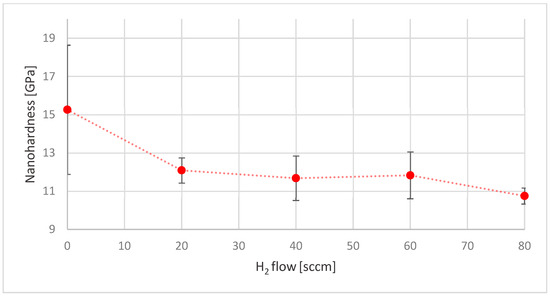 Nanohardness testing revealed that increasing the hydrogen and nitrogen content in the reactive gas atmosphere resulted in a reduction in coating hardness. The coating deposited without additional H2 exhibited significant heterogeneity, as indicated by the large standard deviation observed during measurements. For all other samples, the variation in hardness was considerably lower, with standard deviations of approximately 2 GPa (Figure 2). The highest nanohardness was recorded for the coating obtained in an atmosphere without added H2. The introduction of hydrogen into the reactive atmosphere caused a decrease in hardness to approximately 12 GPa. Further increases in hydrogen concentration did not result in a comparable drop in hardness.