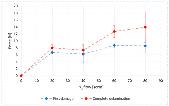 Relation between the first damage and the complete delamination points, and the nitrogen flow.