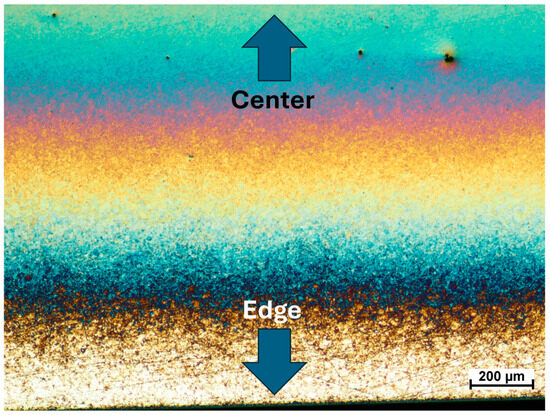 Since even surface-hardened steel exhibits significantly lower hardness compared to diamond-like carbon (DLC) coatings, the reduction in coating hardness diminished the property mismatch at the interface, which contributed to mitigating the disadvantageous cracking behavior. At the same time, as the nitrogen content in the reactive atmosphere increased, a progressively more pronounced edge effect was observed, spreading from the sample edges further into its surface — as clearly documented in the microscopic images (Figure 5 and Figure 6). At a nitrogen flow rate of 80 sccm, this effect extended into the scratch test measurement area, which may have contributed to the observed reduction in coating adhesion.
