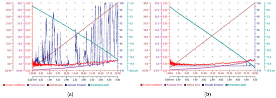 Scratch test graphs of acoustic emission, friction force, normal force, and penetration depth as a function of scratch length for sample 1:4:1 (a) and 4:4:1 (b).