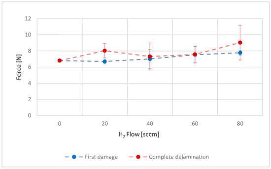In the course of assessing the effect of hydrogen concentration in the reactive gas mixture on coating adhesion, it was found that the presence of nitrogen at a minimum flow rate of 20 sccm was necessary to produce a coating that did not undergo spontaneous delamination upon opening the CVD chamber. All coatings included in this study were therefore synthesized at this nitrogen flow rate. No clear or statistically significant trend was observed in the adhesion values with increasing hydrogen content—both initial failure points and complete delamination were recorded at indenter loads ranging between 7 and 9 N (Figure 8).