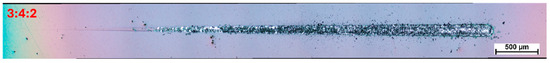 Based on the findings presented above, a carbon coating was also synthesized using a mixed gas composition with a nitrogen-to-methane-to-hydrogen ratio of 3:4:2, and its adhesion performance was subsequently evaluated (Figure 10). In this case, the first signs of coating damage were observed at an indenter load of approximately 8 N, while complete delamination did not occur until the load reached 15.7 N. These values were compiled and presented alongside data from coatings produced under boundary gas compositions, for comparison.