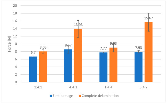 Adhesion tests were conducted using a CSM Revetest Scratch Tester (CSM Instruments, Needham, MA, USA). Three scratches, each 5 mm in length, were made on each sample, with a progressively increasing load ranging from 1 to 30 N. A Rockwell diamond cone with a tip rounding radius of 0.2 mm was used as the indenter. The resulting scratches were documented through photography using a Nikon Eclipse LV150N metallographic microscope (Nikon Metrology, Inc., Brighton, MI, USA). Based on the obtained images, the locations of the first damage and the complete delamination of the carbon layers were identified. The distances of these points from the beginning of the scratch were converted into the corresponding load values.