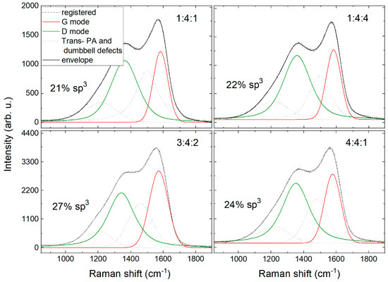 Figure 12 shows Raman spectra of the hydrogenated DLC coatings produced in different reactive atmospheres with calculated sp3 content from Equation (1). The measured spectra were fit with five elementary components. The parameters of elementary components are shown in Table 4. A single crystal graphite shows a Raman active band E2g, labeled as G (Graphite), at ~1580 cm−1. G peak is a representation of the stretching modes of sp2 sites. With the amorphization, an A1g mode appears at ~1350 cm−1, known as the D peak (Disorder) [3,57]. D mode is assigned to breathing modes of sp2 sites in graphite rings. In the measured spectra, we identified additional modes related to the active presence of hydrogen in the coating material. They are recognized in the literature as characteristic of transpolyacetylene (Trans-PA): chain stretching vibrations ~1150 cm−1 of Trans-PA [55,58] and “wagging” vibrations ~1450 cm−1 of Trans-PA [55]. The “dumbbell” interstitial defects appearing ~1700 cm−1 have also been identified [55,59,60].