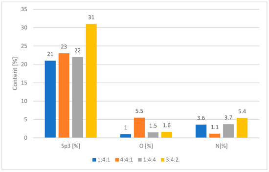 While the first two relationships were clearly observed, the sp3 bond fraction was not the lowest for the sample produced at the highest nitrogen flow rate. This anomaly is most likely attributed to the simultaneous decrease in hydrogen content in the reactive gas mixture, which promoted the incorporation of oxygen—present as an impurity—into the coating structure. The presence of oxygen may have hindered nitrogen bonding, paradoxically resulting in the lowest nitrogen content in the coating synthesized under the nitrogen-richest atmosphere. Similarly, the 3:4:2 sample exhibited the highest sp3 bond fraction despite its high nitrogen content, which is somewhat unexpected in light of the reported literature data on the behavior of nitrogen [43].