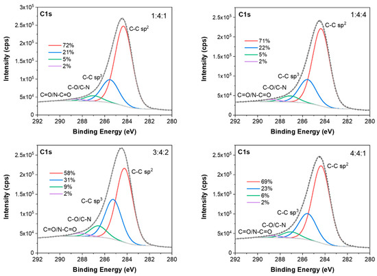 In Figure 14, the fittings of C 1s spectra for the investigated coatings are shown. The fitted C1s spectra consist of two major peaks at about 284.3 and 285.5 eV originating from C-C sp2 and C-C sp3 bonding in carbon coatings [48]. The other two minor peaks present in these spectra at higher binding energies (about 287.0 and 288.5 eV) are related to oxygen and nitrogen functional groups (C-O/C-N and C=O/N-C=O, respectively) [62].