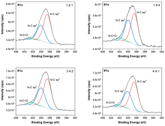 The N1s spectra of carbon coatings were fitted into three peaks, as shown in Figure 15. The peaks located at about 398.5 eV and 400.0 eV correspond to N atoms bonded to sp3-coordinated C atoms (N-C sp3) and N atoms bonded to sp2-coordinated C atoms (N-C sp2), respectively [62]. The peak at about 402.3 eV was assigned to the N-C=O bond [62]. The fitted O1s spectra (Figure 16) consist of three peaks at about 531.2, 532.4, and 534.5 eV that correspond to C=O, O-C-O, and H-O-H bonds, respectively.