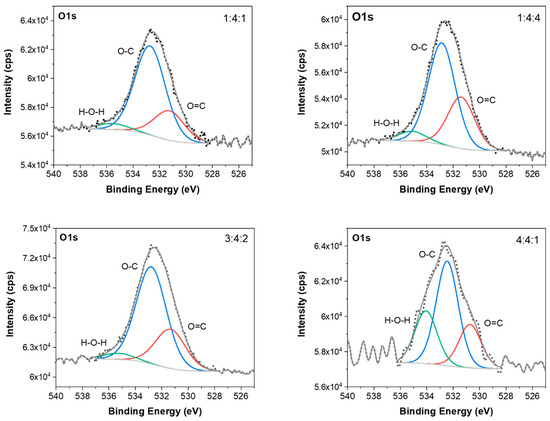 Oxygen is another element commonly present in carbon coatings, although it is often regarded as a contaminant. The available literature on the effect of oxygen incorporated into the structure of amorphous carbon films is relatively limited. Nevertheless, there are reports suggesting that the presence of oxygen can contribute to increased coating hardness and promote a higher sp3 bond fraction [49], which consequently leads to elevated internal stresses within the film [50]. In reactive magnetron sputtering processes, oxygen plasma has been reported to selectively remove sp2-hybridized carbon not bonded to hydrogen, thus promoting the formation of sp3 bonds [51,52]. Therefore, oxygen exhibits an effect opposite to that of nitrogen, and its presence in the film may also influence the final functional properties of the deposited coating.