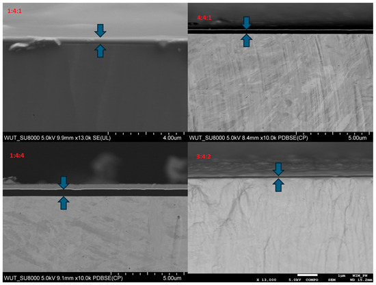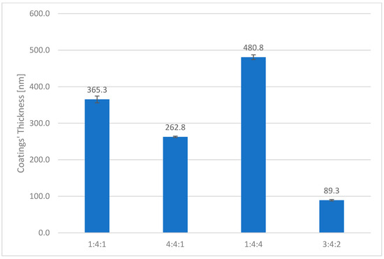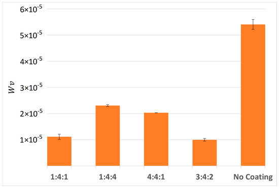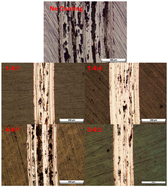 Measurements performed using an optical profilometer, combined with calculated specific wear rates, confirmed that the lowest wear was recorded for the 1:4:1 and 3:4:2 samples. Once again, the deepest grooves were observed on the reference sample (Figure 21), the 4:4:1, and the 1:4:4 sample, which had failed the fastest. The difference in specific wear rate, calculated using Equation (2), between the 4:4:1 and 1:4:4 samples, and the best-performing 3:4:2 sample, was more than twofold. All coated samples exhibited significantly higher wear resistance compared to the uncoated reference sample, whose wear rate was over five times greater than that of the best-performing coating (3:4:2) (Figure 21).
