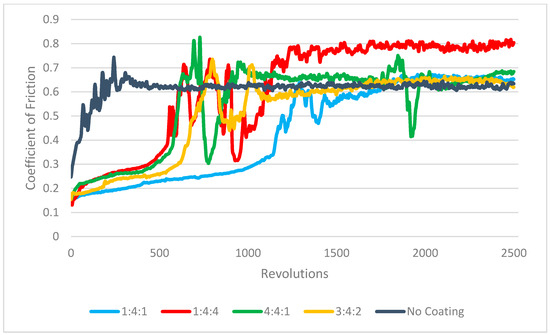 Tribological tests confirmed that the applied carbon coatings—regardless of the gas composition—significantly reduced the wear coefficient compared to the uncoated steel substrate. Analysis of the friction coefficient curves showed that, as long as the coating remained structurally intact, it effectively reduced friction in comparison to the bare substrate. The most favorable performance in terms of wear resistance was observed for the coating produced under the 3:4:2 gas mixture, followed closely by the 1:4:1 coating. The highest enhancement in wear resistance was therefore recorded for the coating with the highest measured hardness (1:4:1) and for the coating exhibiting the highest sp3 bond fraction but lower hardness and thickness (3:4:2), likely due to a higher content of non-carbon–carbon bonds in the structure. An increase in wear resistance with coating hardness is well documented in the literature, although this relationship has mostly been observed for carbon coatings deposited on silicon substrates, where the hardness mismatch between the coating and the substrate is significantly smaller [12]. In the case of steel substrates, the tribological performance of carbon coatings is typically limited more by their adhesion than by their hardness, particularly in the absence of an interlayer. It is also reported that nitrogen-doped carbon coatings, while softer, exhibit superior adhesion to soft substrates, which can result in longer service life in practical applications [15,16,46]. Despite differences in deposition technique, a similar trend was reported by Kao et al. [15], confirming the consistency of the observed behavior.