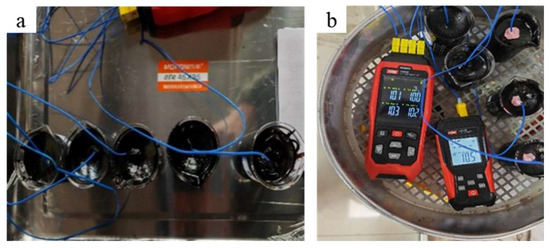 The thermoregulation test process: (a) specimen with embedded temperature sensor; (b) Thermocouple thermometer and specimen.