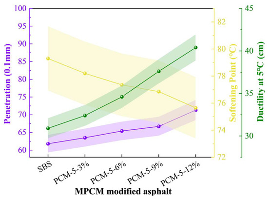 - As PCM-5 dosage increased, penetration and ductility of the modified asphalt improved significantly, while the softening point showed only a slight decrease. These results suggest that PCM-5 enhances low-temperature flexibility without compromising high-temperature performance. Viscosity measurements further indicated improved workability and flow characteristics with microcapsule addition.