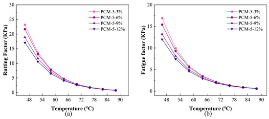 Temperature scanning test results of MPCM modified asphalt: (a) Rutting factor; (b) Fatigue factor.