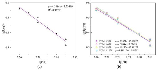 Based on the calculation results for SBS temperature-modified asphalt with a 6% dosage shown in the table, a linear fit was performed using temperature as the horizontal coordinate and the double logarithm of the equivalent viscosity, lg(lg()), as the vertical coordinate. The slope of this fitted line represents the viscosity–temperature index. The results are presented in Figure 5.