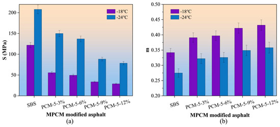 Figure 6 presents the creep stiffness (S) and m-value of MPCM-modified asphalt. The addition of PCM-5 reduces the creep stiffness of SBS-modified asphalt, with greater reductions observed at higher dosages. At •18 °C, each 3% increase in PCM-5 content led to decreases in S of 27.9%, 8.7%, 35.4%, and 11.1%, respectively. At •24 °C, the corresponding decreases were 2.4%, 10.4%, 17.9%, and 31.4%. These results indicate that PCM-5 reduces the brittleness of asphalt and effectively improves its viscoelasticity and toughness in cold environments, thereby significantly enhancing its low-temperature crack resistance. PCM-5 also increases the creep rate (m-value) of SBS-modified asphalt, with m-values rising as the microcapsule content increases. At •18 °C, each 3% increment in PCM-5 raised the m-value by 1.4%, 1.5%, 6.3%, and 2.4%, respectively. At •24 °C, the increases were 17.1%, 1.2%, 7.1%, and 2.6%. These findings demonstrate that PCM-5 microcapsules significantly enhance the stress relaxation capacity of SBS-modified asphalt under low-temperature conditions. At •12 °C, creep stiffness and m-value measurements were not obtained for any PCM-modified asphalt samples due to beam deflections exceeding 5 mm. During the preparation of phase-change asphalt, higher temperatures are required to ensure uniform dispersion of PCM-5 microcapsules within the SBS-modified asphalt matrix. However, these elevated temperatures increase the likelihood of microcapsule rupture, resulting in a softer asphalt blend and a corresponding reduction in low-temperature crack resistance. Thus, while higher processing temperatures are necessary for effective PCM-5 dispersion, increased microcapsule content also raises the risk of rupture, leading to greater softening and reduced brittleness at low temperatures [38].