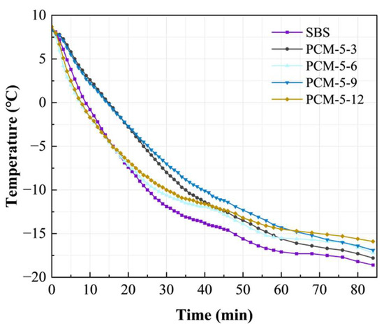 The results of the temperature regulation test are presented in Figure 7. The addition of PCM-5 slowed the cooling rate of SBS-modified asphalt under low-temperature conditions. Using the temperature at 30 min as a reference, phase-change-modified asphalt containing 3%, 6%, 9%, and 12% PCM-5 showed temperature increases of 3.9 °C, 1.3 °C, 4.9 °C, and 2.0 °C, respectively, compared to pure SBS-modified asphalt. After being maintained at •19 °C for 84 min, the recorded temperatures of pure SBS-modified asphalt and PCM-5-modified asphalt with different dosages were •18.6 °C, •17.8 °C, •17.2 °C, •16.9 °C, and •16.0 °C, respectively. Within the phase-change temperature range of PCM-5 microcapsules, a temperature gradient gradually developed between the phase-change-modified asphalt and the SBS-modified asphalt as the internal temperature changed. Starting from 60 min, the temperature of the modified asphalt containing phase-change material gradually approached that of the SBS-modified asphalt, with the temperature difference decreasing continuously until equilibrium was reached. This indicates that the phase-change process within the asphalt had completed and the material no longer released heat under low-temperature conditions, resulting in a decline in thermal regulation efficiency. Overall, PCM-5 microcapsules demonstrated excellent performance in effectively reducing the internal temperature of the asphalt and delaying the occurrence of its minimum temperature.