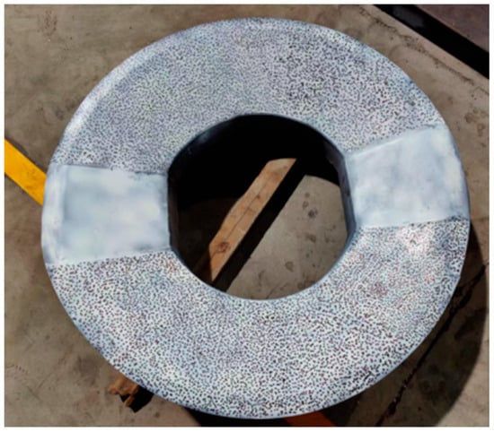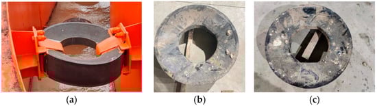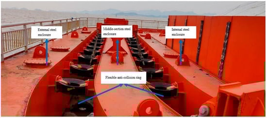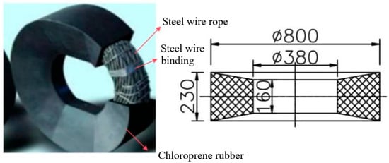 A schematic diagram of the structure of the flexible anti-collision ring is shown in Figure 3, consisting of a binding wire rope ring and a highly elastic rubber layer. When making it, the wire rope is coiled and bound to prevent deformation and then vulcanized and covered with neoprene on the outside to form the anti-collision ring. In this test, the outer diameter of the anti-collision ring is 800 mm, the inner diameter is 380 mm, the cross-section is trapezoidal, and the bottom side lengths are 230 mm and 160 mm, respectively.