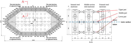 The main piers of Xiangshan Port Highway Bridge are equipped with flexible guided anti-collision devices as a preventive measure against vessel impacts (Figure 1). The defense grade is designed to accommodate a speed of 3.7 m/s for a 50,000-ton bulk carrier. Through preliminary numerical simulation calculations, when the main piers of the Xiangshan Port Highway Cross-sea Bridge have no anti-collision devices, the instantaneous maximum ship impact force is as high as 140 MN, and the average ship impact force is about 110 MN, exceeding the designed anti-collision capacity of the main piers (85 MN). When there is no anti-collision device, the ship’s impact force will cause serious damage to the pier, and the bow of the ship will also be severely damaged. Therefore, effective anti-collision facilities must be adopted to reduce the ship’s impact force. According to the anti-collision design requirements, flexible anti-collision devices are installed on the main piers and auxiliary piers near the navigable holes. The main pier’s flexible guide anti-collision device and its structure are shown in Figure 1 and Figure 2.
