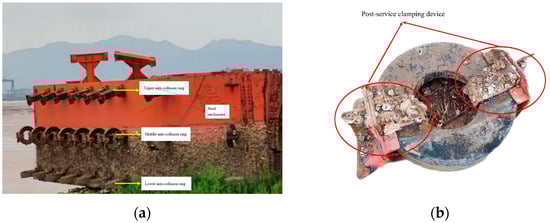 Flexible anti-collision device after service. (a) Partially removed anti-collision device. (b) Anti-collision ring clamping device.
