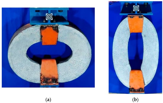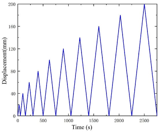 In this test, the MTS 500 kN actuator cylinder (maximum stroke ±250 mm) was used to perform quasi-static loading on the flexible anti-collision ring, and the force–displacement response information was recorded in real time by the embedded sensor. A schematic diagram of the test loading is shown in Figure 7. The anti-collision ring fixture removed from the original anti-collision device was selected as the test fixture to ensure that the constraints in the test are basically consistent with the actual engineering conditions. Meanwhile, in order to study the mechanical response and energy dissipation characteristics of the anti-collision ring under different degrees of deformation, a displacement controlled stepwise loading and unloading method was adopted for the test. The increment of each loading displacement was 20 mm, and the loading was carried out in 10 stages until the final displacement (200 mm) at a loading speed of 0.8 mm/s. The loading time-displacement curve of the test is shown in Figure 8. Two anti-collision rings were collected from each structural layer (upper, middle, and lower), comprising six anti-collision rings in total. For each layer, one ring was subjected to tensile testing while the other underwent compressive testing, and the test conditions are shown in Table 1. The maximum displacement deformation of the compression test and the tensile test is shown in Figure 9.