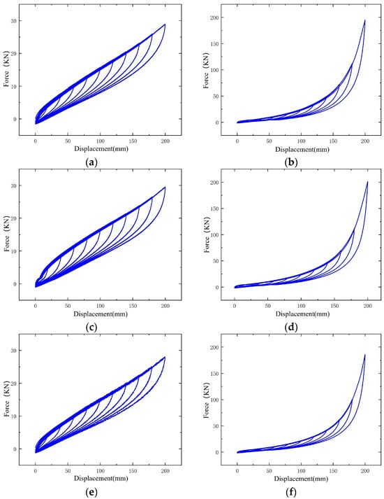 The force–displacement curves obtained from the tests of flexible anti-collision rings at different service positions (degree of corrosion) are shown in Figure 10. As shown in Figure 10, the flexible anti-collision ring exhibits significant viscoelastic deformation characteristics under both compressive and tensile loads, that is, there is a distinct envelope region between each loading and unloading curve, with a full envelope shape, indicating good energy dissipation characteristics during the deformation process. Under compressive load, the peak load-bearing capacity of the upper layer (Figure 10a), middle layer (Figure 10c), and lower layer (Figure 10e) of the flexible anti-collision ring is 29.0 kN, 29.6 kN, and 28.1 kN, respectively, showing an approximately linear growth trend with increasing displacement. As shown in Figure 10b,d,f, under tensile load, the peak load-bearing capacity of the upper (Figure 10b), middle (Figure 10d), and lower (Figure 10f) anti-collision rings is 194.7 kN, 201.6 kN, and 185.9 kN, respectively, when the loading displacement ranges from 0 to 100 mm, the bearing capacity demonstrates a nearly linear growth trend as the displacement increases. However, when the loading displacement surpasses 100 mm, the bearing capacity shows a pronounced nonlinear growth trend. In the tensile test, the slope of the force–displacement curve exhibits a marked increase, leading to a rapid rise in the bearing capacity. By comparing the trends of bearing capacity in the compression and tensile test curves, it is known that the mechanical response of the flexible anti-collision ring shows obvious tension–compression asymmetric. Finally, when the loading displacement reaches 200 mm, the bearing capacity value corresponding to the tensile test curve (201.6 kN) is 6.8 times that corresponding to the compression test curve (29.6 kN).