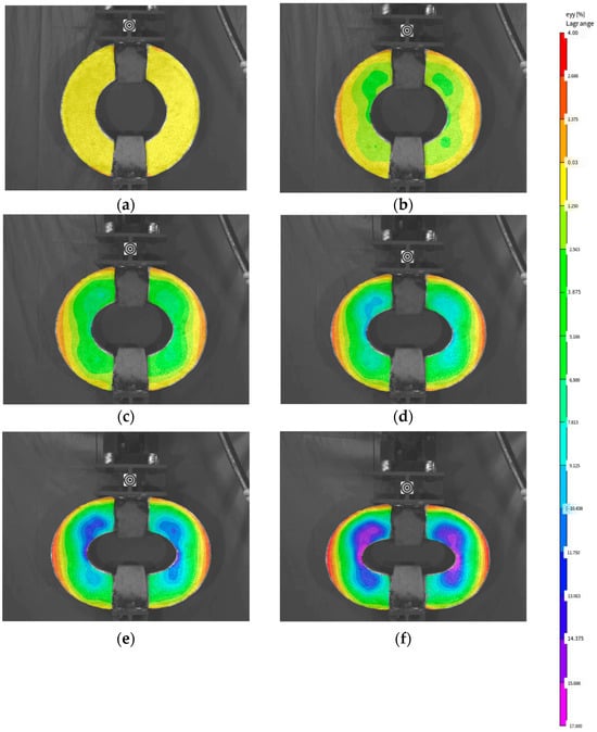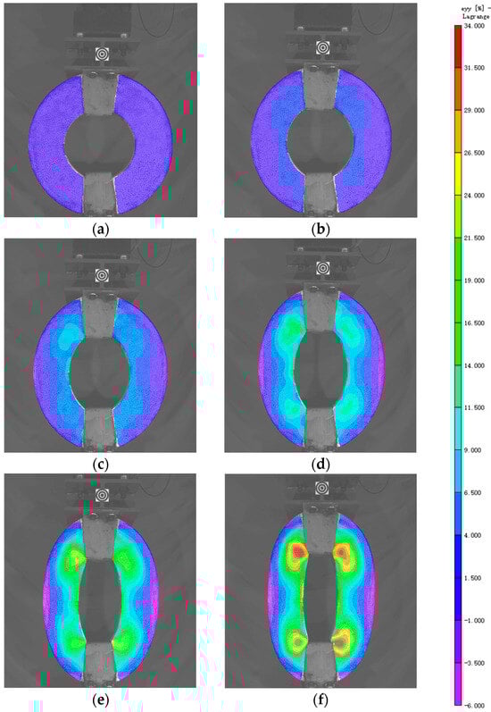 Cloud of strain variation in the anti-collision ring under tensile test conditions. (a) 0 mm. (b) 40 mm. (c) 80 mm. (d) 120 mm. (e) 160 mm. (f) 200 mm.