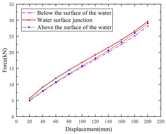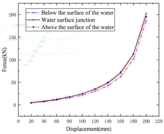 As shown in Figure 16 and Figure 17, under the same loading conditions, each layer of the anti-collision ring exhibits basically consistent mechanical properties in terms of step-by-step bearing capacity and loading curves. The peak bearing capacity of the middle and upper fender layers is close, while that of the lower fender layer is slightly lower than that of the middle and upper layers. This indicates that under long-term different marine service environments, the mechanical properties of the flexible energy-absorbing fender layers remain basically consistent and have not been significantly affected.