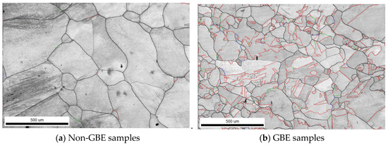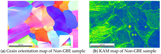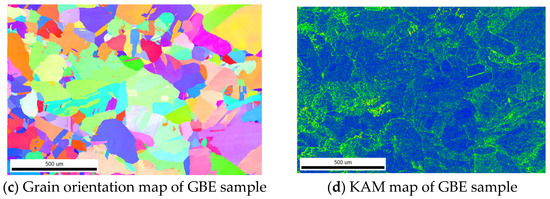 Figure 1b,d display the kernel average misorientation (KAM) maps of the Non-GBE and GBE samples, respectively. KAM maps are widely used to evaluate the extent of recrystallization. As shown in Figure 1b,d, the Non-GBE sample surface is predominantly light green, indicating a static recrystallization volume fraction of only 0.41% (see Table 2). In contrast, the GBE sample surface is largely blue, with a significantly higher static recrystallization volume fraction of 45.2%. This suggests that after tensile deformation and heat treatment, the recrystallized region within the weld seam expands substantially, and the proportion of low-ΣCSL grain boundaries is primarily determined by the recrystallization process.