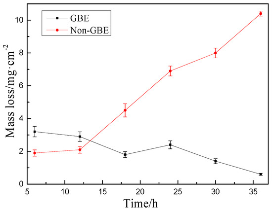 The hot corrosion kinetics curve is a critical parameter for evaluating the resistance of alloys to high-temperature molten salt corrosion. Figure 3 illustrates the corrosion behavior of Non-GBE and GBE samples in a mixed molten salt environment consisting of 75% Na2SO4 and 25% NaCl at 900 °C. As shown in the figure, the corrosion rates of the two samples vary across different time intervals. During the entire 36 h exposure period, the Non-GBE sample exhibited a continuously increasing mass loss trend, with a final corrosion rate of 0.8484 mg/cm2·h. In contrast, the GBE sample showed significantly lower mass loss throughout the test, maintaining a much slower corrosion rate of only 0.3397 mg/cm2·h, indicating its superior resistance to molten salt-induced hot corrosion.