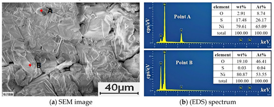 The surface of the GBE sample, following 36 h of corrosion in molten salt at 900 ℃, was analyzed using EDS. As illustrated in Figure 5, the corroded surface of the Ni200 alloy weld primarily contains Ni, O, and S, with no detectable Cl. These results indicate that the surface is predominantly covered with sulfides and oxides.