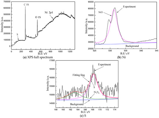 The surface corrosion products of both Non-GBE and GBE samples in the molten salt environment are identical, consisting primarily of NiO and Ni3S2. Figure 6 presents the XPS full spectrum and high-resolution spectra of the samples after 36 h of exposure to molten salt at 900 °C. As shown in Figure 6a, distinct peaks corresponding to S 2p, C 1s, O 1s, and Ni 2p3/2 can be clearly identified, indicating that the corrosion products on the sample surface are mainly nickel sulfides and oxides. Figure 6b displays the deconvoluted Ni 2p3/2 spectrum, where the peak at 529.4 eV corresponds to NiO. In Figure 6c, a characteristic peak at approximately 163 eV confirms the presence of Ni3S2.
