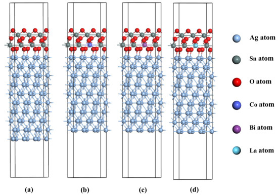 Interface model: (a) AgSnO2; (b) AgSnO2-Co; (c) AgSnO2-Bi; (d) AgSnO2-La.