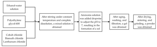 Dopant elements were incorporated into SnO2 unit cell via sol–gel methodology [20]. To match the atomic substitution doping model used in the simulation, sol–gel synthesis was employed to prepare SnO2 powders doped with Co, Bi, and La. Tin tetrachloride (SnCl4) was used as the raw material for preparing SnO2 powder, with lanthanum chloride (LaCl3), cobalt chloride (CoCl2), and bismuth chloride (BiCl3) as additives. An ethanol-distilled water solution was prepared by mixing anhydrous ethanol and distilled water as the solvent. Weak alkaline ammonia water (NH3·H2O) was used as the precipitant. Polyethylene glycol 400 (PEG-400) was used as the dispersant. The core steps involve the following: (1) dispersing metal salts in a solvent to form a homogeneous solution; (2) forming a sol through hydrolysis and polycondensation reactions; (3) aging the sol to allow colloidal particle aggregation forming a non-flowing gel; and (4) finally obtaining the target powder through evaporation, drying, and sintering. The preparation process flow is shown in Figure 2.