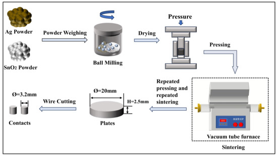 The mass of each electrical contact sample prepared in this experiment was 10 g. The mass ratios and atomic ratios of the main components are listed in Table 2. Powder metallurgy was employed to fabricate the electrical contact samples. Firstly, silver powder and the sol–gel prepared doped SnO2 powder were weighed according to Table 2 ratios and thoroughly mixed using a high-energy ball mill. The mixed powder underwent processes including initial pressing, primary sintering, re-pressing, secondary sintering, and final re-pressing. A 769YP-60E (Tianjin KEQI High & New Technology Corpoartion, Tianjin, China) powder tablet press was used for initial pressing and re-pressing, with an initial pressure of 10 MPa (17.6 T), holding for 15 min, and re-pressing pressure of 20 MPa (35.2 T), holding for 15 min. Sintering was conducted in a SKGL 1200C (Shanghai Jvjing Precision Instrument Manufacturing Co., Ltd., Shanghai, China) vacuum tube furnace, with the primary sintering temperature set at 500 °C, holding time 120 min, and secondary sintering temperature set at 800 °C, holding time 120 min. Subsequently, the samples were ground and polished, and finally wire-cut to produce electrical contacts with a diameter of 3.2 mm and a thickness of 2.5 mm. The preparation process for the electrical contact samples is depicted in Figure 3.