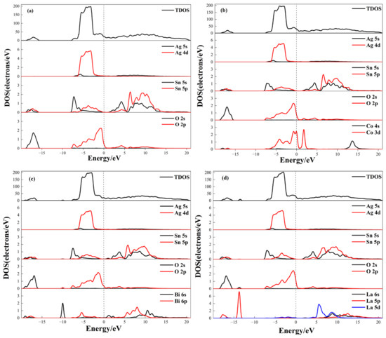 Density of states of doped AgSnO2: (a) AgSnO2; (b) AgSnO2-Co; (c) AgSnO2-Bi; (d) AgSnO2-La.