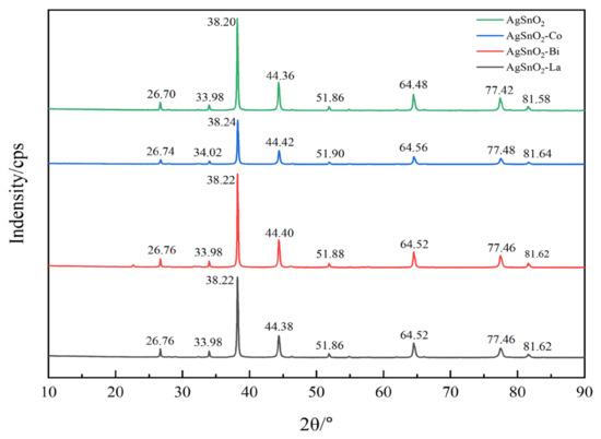 The phase structure of the samples was analyzed using a Bruker D8 DISCOVER X-ray diffractometer (Cu Kα radiation, λ = 0.15405 nm). Testing conditions were as follows: scanning range 10°–90°, scanning speed 6°/min, and power 4 kW. If the main diffraction peak positions in the XRD spectra of doped AgSnO2 contacts coincide with those of the undoped sample and no new diffraction peaks appear [26], it indicates that the dopant elements have entered the SnO2 unit cell via substitution, consistent with the simulated interface model. The XRD results, shown in Figure 5, indicate that the XRD pattern of undoped AgSnO2 electrical contact material mainly includes eight distinct diffraction peaks, among which 26.70°, 33.98°, and 51.86° are phase peaks of SnO2, and 38.20°, 44.36°, 64.48°, 77.42°, and 81.58° are phase peaks of Ag. The XRD patterns of the doped AgSnO2 materials illustrate that the diffraction peak positions remain essentially unchanged compared to the undoped material, with only slight deviations in diffraction angle after doping, primarily attributed to lattice distortion induced by doping. This corresponds to the change in lattice constant caused by the difference in atomic radius of dopant atoms in the simulation. Furthermore, no new diffraction peaks are observed in the XRD patterns before and after doping, indicating that doping did not introduce other substances or generate new phases. This confirms the successful doping of Co, Bi, and La elements into the AgSnO2 material via sol–gel and powder metallurgy processes. Dopant elements entered the SnO2 unit cell in the form of atomic substitution, verifying the accuracy of the atomic substitution doping model constructed in the simulation.