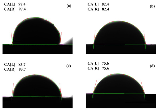 The results of wetting angle: (a) AgSnO2; (b) AgSnO2-Co; (c) AgSnO2-Bi; (d) AgSnO2-La.
