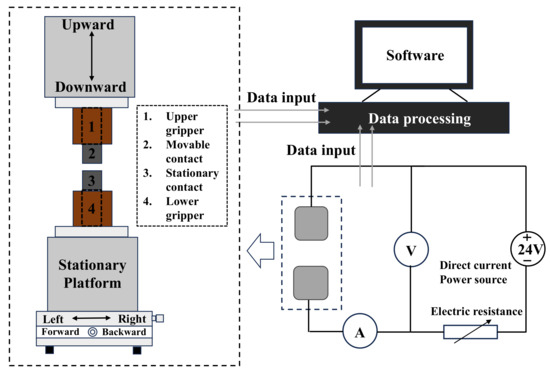 The JF04D electrical contact material testing system was employed to simulate actual operating conditions for electrical contact experiments. The structure of the testing system is shown in Figure 7, where the movable contact is the anode and the stationary contact is the cathode. Experimental parameters were set as follows: protection voltage ±40 V, operating current DC 15 A, test voltage DC 24 V, operating frequency 60 cycles/min, contact force 86 cN, and switching cycles 100,000 times. This device acquired parameters such as arc energy, arc duration, welding force, and contact resistance, providing multi-faceted data for comprehensive material evaluation. Elevated arc energy and duration indicate more severe arc erosion. Excessively high contact resistance causes localized temperature escalation, leading to material melting or contact failure. Reducing contact resistance and improving its stability are key to optimizing material electrical contact performance. Smaller welding force indicates better anti-welding performance of the electrical contact material [28,29,30,31,32]. Studying the performance and erosion degree of electrical contact materials during arc erosion holds significant theoretical and practical importance.