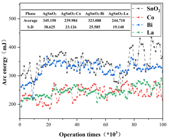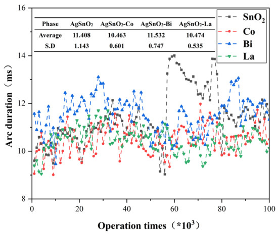 Arc energy and arc duration are key parameters for evaluating the arc erosion resistance of electrical contact materials. Higher values make contact materials more prone to welding, exacerbate surface metal loss, and abbreviate service life. The doped AgSnO2 materials were tested using a symmetric anode configuration. Measurement data was divided into 100 data points (averaging every 1000 operations per data point), and the mean value and standard deviation (S.D.) were calculated for each group. Figure 8 demonstrates that arc energy increases with the number of operations, with the undoped system showing the largest increase and the highest mean and S.D. values. Figure 9 exhibits analogous trends for arc duration. Doped systems manifested distinct optimization: Co and La doping simultaneously reduced the mean and S.D. of arc energy, while the fluctuation in arc duration decreases, becoming more stable. This indicates that doping improves the arc stability of AgSnO2 electrical contact materials. Bi doping slightly increases the average arc duration due to the material melting caused by its low melting point. Experiments confirm that elemental doping effectively enhances arc erosion resistance and arc stability, with La doping being the most effective for reducing arc energy and improving arc stability.