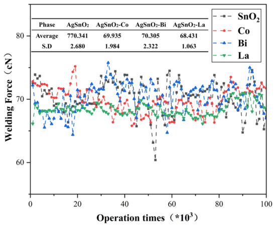 Welding force is a core indicator for evaluating the anti-welding performance of contacts. Its value is directly related to material composition homogeneity and interfacial stability. Lower welding force denotes better anti-welding properties. Figure 10 depicts the variation curve of welding force with the number of operations. Undoped AgSnO2 exhibited a sudden change at 50,000 operations, with a mean welding force of 70.341 cN and severe fluctuation. Conversely, La- and Co-doped systems perform favorably. The La-doped system registered minimal mean welding force (68.431 cN) and S.D. (1.063), followed by Co doping systems. Both are lower than the undoped system, and the welding force curve is smoother with fewer abrupt changes. This indicates that La and Co doping make AgSnO2 contact material more stable. Doping promotes the uniform dispersion of SnO2 particles, filling voids in the Ag matrix, improving interfacial wettability, inhibiting interfacial motion, and enhancing the anti-welding performance of the contacts. Bi doping may slightly increase welding force due to surface inhomogeneity. Experiments confirm that doping effectively improves the anti-welding performance of AgSnO2 contact materials, with La doping showing the best overall performance.