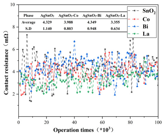 Contact resistance affects material performance, as the high contact resistance characteristic of AgSnO2 contacts not only intensifies temperature rise at the contact interface but also aggravates arc erosion on the contact surface, shortening contact component life. Figure 11 illustrates the variation in contact resistance with the number of operations: an initial decline followed by ascent and eventual stabilization. The undoped system exhibits severe fluctuations, with resistance values significantly increased after 78,800 operations, attributed to SnO2 detachment from the Ag melt pool and floating up to agglomerate on the contact surface due to arc erosion, resulting in a mean resistance of 4.329 mΩ. Doped samples exhibited lower contact resistance and showed less volatility. This indicates that the introduction of dopant elements improves the stability of the contact interface, thereby enhancing current transmission efficiency and reducing contact resistance. Co doping effectively reduces the contact resistance of AgSnO2 materials through multiple mechanisms such as increasing carrier concentration, optimizing lattice structure and interface bonding, and refining grains. The La-doped system exhibited the most stable contact resistance fluctuation and the smallest mean value. This is because La doping leads to uniform distribution of additives in the matrix, effectively inhibiting SnO2 particle agglomeration, improving material homogeneity. It also alters arc diffusion characteristics, enhancing arc stability and reducing concentrated discharge.