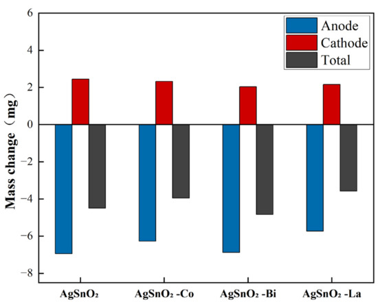 During arc discharge, evaporation and splashing occur on the electrical contact surface, leading to contact damage and material loss. Material transfer and material loss are key indicators for evaluating the lifespan of electrical contacts. After completing the electrical contact test experiment of 100,000 switching operations, the mass change of the contacts was measured using a Sartorius Genius series ME235S electronic balance, Sartorius AG (Göttingen, Germany). Figure 12 shows the mass change of the anode and cathode contact materials and the total mass loss caused by arc erosion. Before doping, the material transfer and total mass loss of AgSnO2 electrical contacts were high, while the total mass loss of doped samples decreased. This is attributed to the improved wettability between SnO2 and Ag due to the introduction of dopant elements, promoting the dispersion of SnO2 particles in the metal melt pool. High-melting-point, strongly thermally stable SnO2 covers the molten Ag, effectively inhibiting the splashing of Ag in the melt pool, thereby reducing the arc erosion of the material. Co and La doping reduced material transfer from anode to cathode. In particular, AgSnO2-La electrical contact material exhibited the least material transfer and material loss, indicating that it has better electrical performance and higher thermal stability, and is less likely to degrade under arc influence. The experiment confirmed that doping effectively improves the thermal stability of AgSnO2 contact materials.