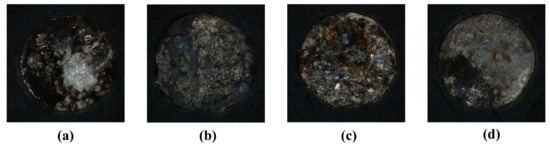 When movable and stationary contacts touch, initial contact occurs at micro-asperity peaks, forming gaps in non-contact areas. After 100,000 electrical contact test cycles, the anode contact surfaces were scanned using an Olympus DSX1000 digital microscope, Olympus Corporation (Tokyo, Japan). The 2D macroscopic morphology is shown in Figure 13. Undoped AgSnO2 surface shows localized concentrated erosion; black areas are oxidation products of molten Ag droplets. In contrast, doped systems exhibit more uniform erosion morphologies due to the uniform distribution of dopants in the matrix. Among them, the La-doped sample demonstrated minimal erosion diameter and flattest contact surface, followed by the Co-doped sample. La doping enhanced interfacial bonding strength, inhibiting SnO2 agglomeration induced by arcs. Its low contact resistance and potent arc stability reduce localized Joule heating. Increased melt pool viscosity (wetting angle 75.6°) inhibits the formation of large arc craters and the possibility of severe erosion. This morphological feature provides multi-scale validation for the optimal interfacial stability of the La system predicted by simulation.