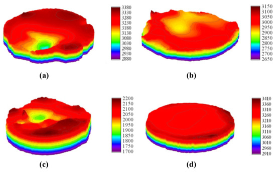 Two-dimensional topography scan of electrical contact. (a) AgSnO2; (b) AgSnO2-Co; (c) AgSnO2-Bi; (d) AgSnO2-La.